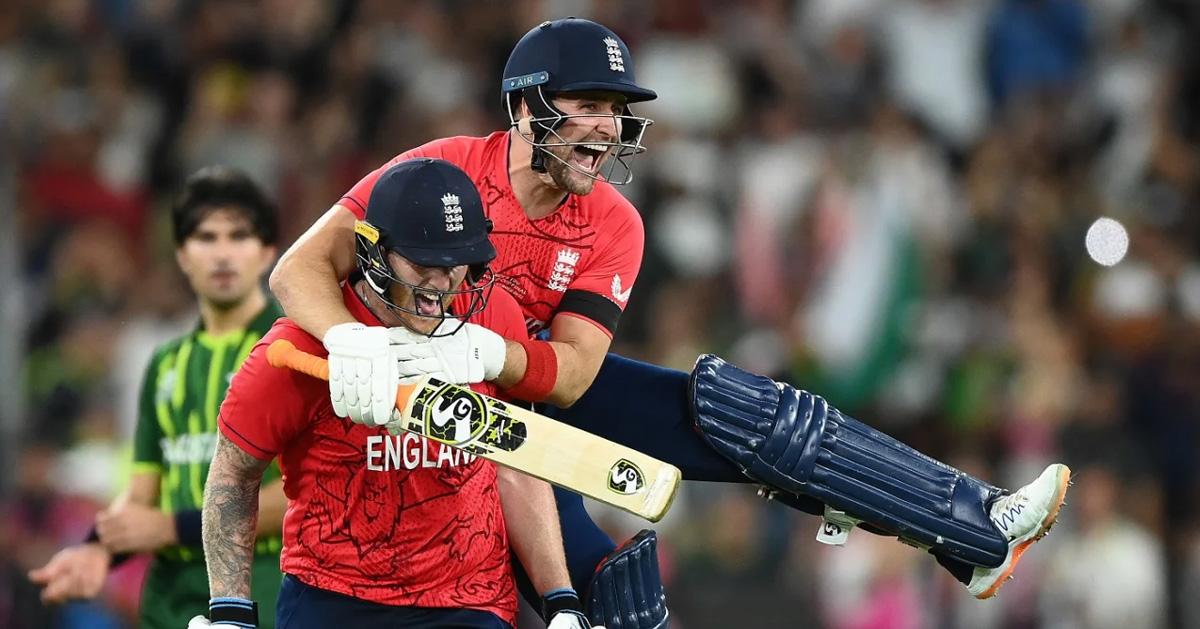 2022 ടി – 20 ലോകകപ്പ് ഫൈനലിലെ വിജയമാഘോഷിക്കുന്ന ഇംഗ്ലണ്ട് താരങ്ങൾ. Photo: Espncricinfo.com