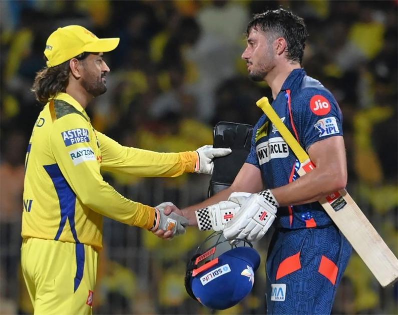 സെഞ്ച്വറി നേടി ടീമിനെ വിജയത്തിലേക്ക് നയിച്ച സ്റ്റോയ്നിസിനെ അഭിനന്ദിക്കുന്ന എം.എസ്. ധോണി. Photo: SuperGiantsArmy™ — LSG FC/x.com