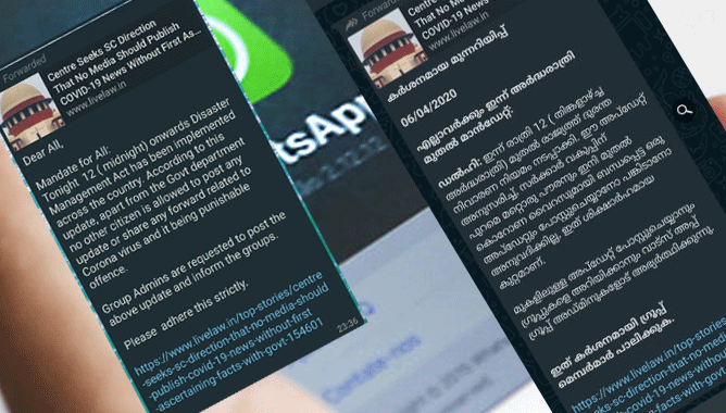 'കൊവിഡ് 19 വാര്ത്തകളും വിവരങ്ങളും ഷെയര് ചെയ്യാനുള്ള അവകാശം സര്ക്കാറിന് മാത്രം, രാജ്യത്തെ പൗരന്മാര് വിവരങ്ങള് ഷെയര് ചെയ്യരുത്'; സോഷ്യല് മീഡിയയില് വ്യാപകമായി വ്യാജസന്ദേശം