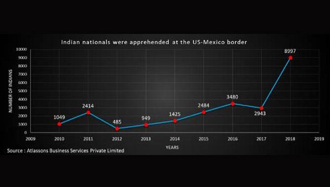 ഇന്ത്യക്കാര് ഏറ്റവും കഷ്ടപ്പെട്ട് കുടിയേറാന് ശ്രമിക്കുന്ന രാജ്യമാണ് അമേരിക്ക, പ്രത്യേകിച്ച് പഞ്ചാബികള്. യു.എസ് ബോര്ഡര് ആന്ഡ് കസ്റ്റംസ് കണക്ക് പ്രകാരം അനധികൃതമായി അമേരിക്കയിലേക്ക് കടക്കാന് ശ്രമിക്കുന്നവരില് രണ്ടാമത്തേതാണ് ഇന്ത്യക്കാര്, ഒന്നാമത്തേത് മെക്സിക്കന്സ്. താഴെ കാണിച്ച ചാര്ട്ട് പ്രകാരം കഴിഞ്ഞ കൊല്ലം മാത്രം അതിര്ത്തിയിലൂടെ നുഴഞ്ഞു കയറാന് ശ്രമിച്ചതിന് പിടിയിലായ ഇന്ത്യക്കാരുടെ എണ്ണം ഒന്പതിനായിരത്തിനടുത്താണ്.