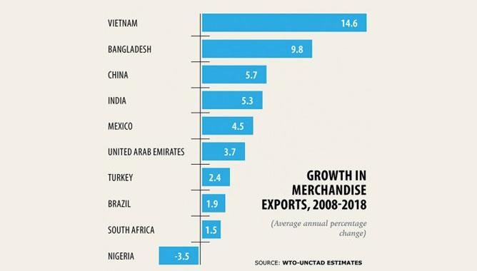 ലോകത്തില് തന്നെ കയറ്റുമതി വളര്ച്ചയില് രണ്ടാം സ്ഥാനത്താണ് ബംഗ്ലാദേശ്, വിയറ്റ്നാമിന് തൊട്ടു പിന്നില്. ചൈനയും അമേരിക്കയുമായുള്ള വ്യാപാര യുദ്ധം ഏറ്റവും മുതലെടുക്കുന്നത് ഈ രണ്ടു രാജ്യങ്ങളാണ്. ലോകത്തിലെ ഏറ്റവും വലിയ വസ്ത്ര കയറ്റുമതിക്കാര് എന്ന സ്ഥാനം ഇന്ത്യയില് നിന്നും അടുത്ത കാലത്താണ് ബംഗ്ലാദേശ് തട്ടിയെടുത്തത്.