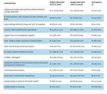 ദല്ഹി ആര്.എം.എല് ആശുപത്രിക്കുവേണ്ടി 885.6 കോടിയെന്ന് പി.ഡി.എഫിലും 753.60 കോടിയെന്ന് എക്സല് ഫയലിലും രേഖപ്പെടുത്തിയിരിക്കുന്നു. 132 കോടിയുടെ വ്യത്യാസമാണ് ഇവ തമ്മിലുള്ളത്. ചണ്ഡീഗഡിലെ പി.ജി.ഐ.എം.ആറിനായി 1426.53 കോടി അനുവദിക്കുന്നെന്ന് പി.ഡി.എഫിലും 1,551.53 എന്ന് എക്സലിലും രേഖപ്പെടുത്തിയിരിക്കുന്നു. 125 കോടിയുടെ വ്യത്യാസമാണ് ഇവിടെയുള്ളത്.