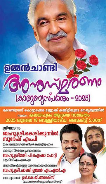 രാഷ്ട്രീയമേതായാലും നല്ലതിനെ നല്ലതെന്നു പറയാന് ഒരു പേടിയുമില്ല. ചിരിച്ചാല് ആത്മാര്ത്ഥതയോടെയാകണം. വിമര്ശനങ്ങളെ ചിരിയോടെ നേരിടുന്നതില് ഉമ്മന് ചാണ്ടി മാതൃകയാണ്. ഉമ്മന് ചാണ്ടിയോടുള്ള ജനസ്നേഹം രാഷ്ട്രീയത്തിന് അതീതമാണ്. ജനപ്രതിനിധി എങ്ങനെയാവണമെന്ന് കാട്ടിക്കൊടുത്തയാളാണ് അദ്ദേഹമെന്നും ഉമ്മന് ചാണ്ടിയുടെ രണ്ടാം ചരമവാര്ഷികത്തോട് അനുബന്ധിച്ച് നടത്തിയ അനുസ്മരണ യോഗത്തില് മുന് എം.എല്. എ കൂട്ടിച്ചേര്ത്തു.