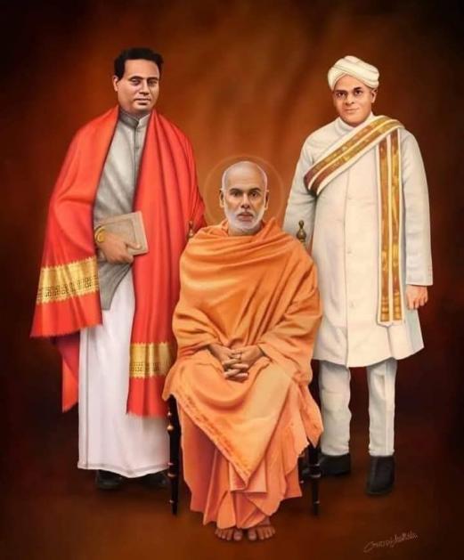 ശ്രീനാരായണ ഗുരുവിനൊപ്പം കുമാരനാശാനും ഡോ. പല്പുവും. ഒരു ചിത്രീകരണം. Photo: ഗുരു ദർശനം – ഗുരു പാദംതേടി/Facebook.com