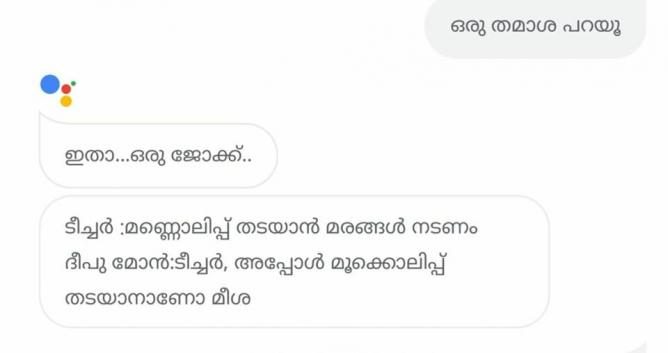 എന്നാല്, ഗൂഗിള് അസിസ്റ്റന്റ് ഉപയോഗിച്ച മലയാളികള് പങ്കുവക്കുന്ന അനുഭവങ്ങള് ചിരി പടര്ത്തുകയാണ് സോഷ്യല്മീഡിയകളില്. ഒരു തമാശ പറയാമോ എന്ന് ഗൂഗിള് അസിസ്റ്റന്റിനോടുള്ള ചോദ്യത്തിന് ഇതാ ഒരു ജോക്ക് എന്ന് പറഞ്ഞ് ഗൂഗിള് പറയുന്നത് മണ്ണൊലിപ്പ് തടയാന് മരങ്ങള് നടണമെന്ന് ടീച്ചര് പറയുമ്പോള് അപ്പോള് മൂക്കൊലിപ്പ് തടയാനാണോ മീശ എന്ന് മറുചോദ്യമുന്നയിക്കുന്ന ദീപുമോന്റെ കഥയാണ് പങ്കുവക്കുന്നത്.