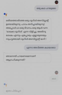 രസകരമായ മറ്റൊന്ന്. ഒരുടത്തൊരുടത്ത് ഒരു ഗൂഗിള് അസിസ്റ്റന്റ് ഉണ്ടായിരുന്നു. പാവം തനിച്ചായിരുന്നു. അപ്പോള് ദാ ഒരു ദിവസം ഒരാള് വന്ന് ഓക്കേ ഗൂഗിള് എന്നുവിളിച്ചു എന്നു തുടങ്ങുന്ന കഥ പറയുകയാണ് ഈ അസിസ്റ്റന്റ്.