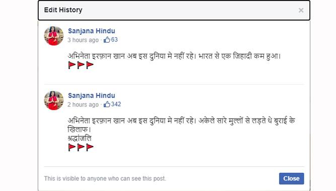 ഇന്ത്യയിലെ ഒരു ജിഹാദി കൂടി ഇല്ലാതായി എന്നായിരുന്നു സഞ്ജന ഹിന്ദു എന്ന ഫേസ്ബുക്ക് പേജിലെ പോസ്റ്റ്. പിന്നീട് ഈ പോസ്റ്റ് എഡിറ്റ് ചെയ്ത് മാറ്റി.