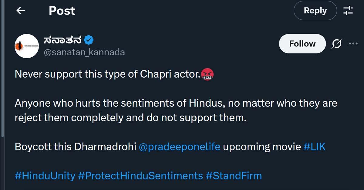 ഹിന്ദുക്കളുടെ വികാരം വ്രണപ്പെടുത്തിയത് ആരായാലും അവരുടെ സിനിമകള് ബഹിഷ്കരിക്കണമെന്നും അവരെ സപ്പോര്ട്ട് ചെയ്യരുതെന്നും പോസ്റ്റില് കൂട്ടിച്ചേര്ത്തു. ധര്മദ്രോഹിയായ പ്രദീപിന്റെ അടുത്ത ചിത്രം എല്.ഐ.കെ ബഹിഷ്കരിക്കണമെന്നും പറഞ്ഞുകൊണ്ടാണ് പോസ്റ്റ് അവസാനിപ്പിക്കുന്നത്. പോസ്റ്റിന് താഴെ പ്രദീപിനെ വിമര്ശിക്കുന്ന കമന്റുകളാണ് അധികവും.