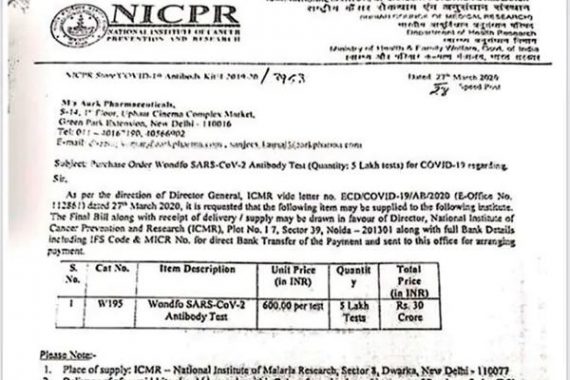245 രൂപയ്ക്ക് ചൈനയില് നിന്ന് ഇറക്കുമതി ചെയ്യുന്ന റാപിഡ് ആന്റി ബോഡി കിറ്റുകള് 600 രൂപയ്ക്ക് വാങ്ങാനാണ് ഐ.സി.എം.ആര്. കരാര് നല്കിയത്. 5 ലക്ഷം കിറ്റുകള്ക്ക് 600 രൂപവെച്ച് 30 കോടി രൂപ വില നിശ്ചയിച്ചു.