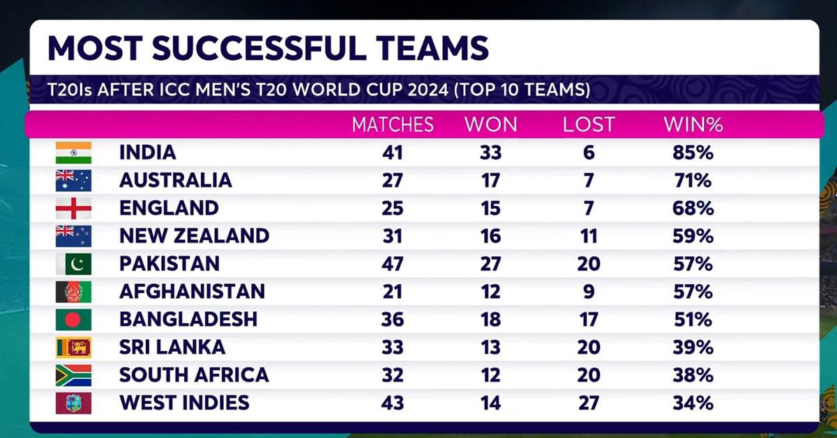 ടി-20 ക്രിക്കറ്റില് വമ്പന് ഡോമിനേഷനുമായാണ് നിലവില് ഇന്ത്യ മുന്നോട്ട് പോകുന്നത്. ഇതോടെ ഇത്തവണ ലോകകപ്പിന് ഇറങ്ങുന്നതിന് മുമ്പേ ഒരു തകര്പ്പന് റെക്കോഡും ഇന്ത്യ സ്വന്തമാക്കിയിരിക്കുകയാണ്. 2024 ടി-20 ലോകകപ്പിന് ശേഷം ഏറ്റവും വിജയകരമായ ടീമാകാനാണ് ഇന്ത്യയ്ക്ക് സാധിച്ചത് (ആദ്യത്തെ മികച്ച 10 ടീമുകളില് നിന്ന്).
