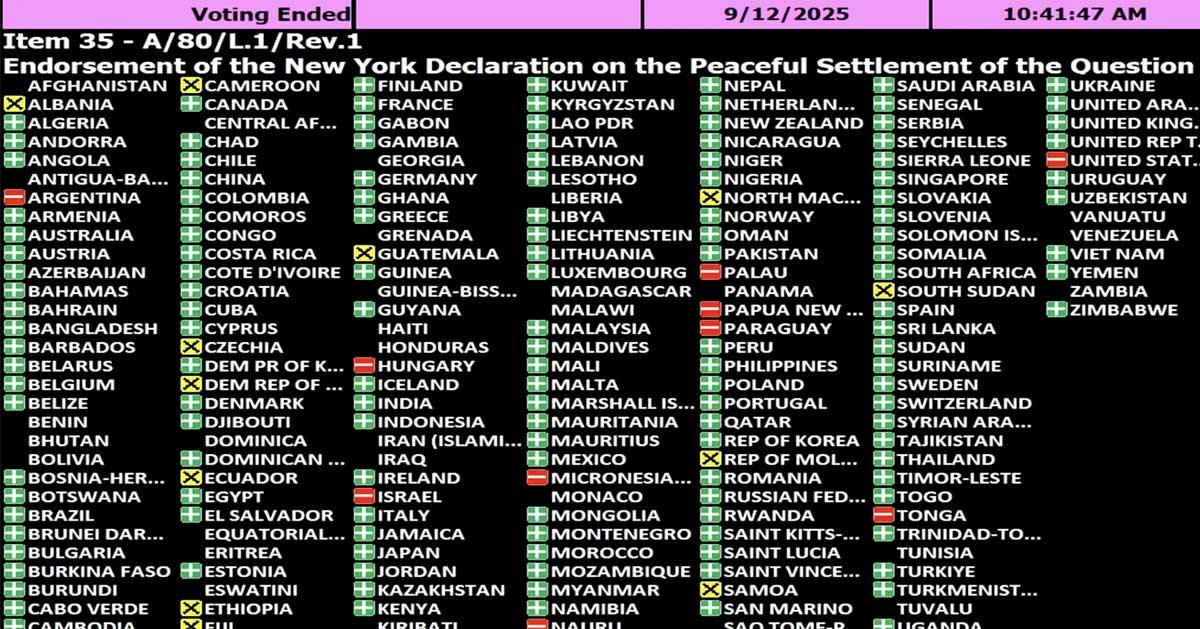 എല്ലാ ഗള്ഫ് രാജ്യങ്ങളും അംഗീകരിച്ചപ്പോള് ഇസ്രഈലും അമേരിക്കയും അടക്കം പത്ത് രാജ്യങ്ങളാണ് സ്വതന്ത്ര ഫലസ്തീനെ അംഗീകരിക്കുന്ന ഈ പ്രമേയത്തെ എതിര്ത്തത്. അര്ജന്റീന, ഹംഗറി, മൈക്രോനേഷ്യ, നൗറു, പലാവു, പാപുവ ന്യൂ ഗിനിയ, പരാഗ്വേ, ടോംഗ എന്നിവരാണ് ഇതിനെ എതിര്ത്ത് വോട്ട് ചെയ്ത മറ്റ് രാജ്യങ്ങള്.