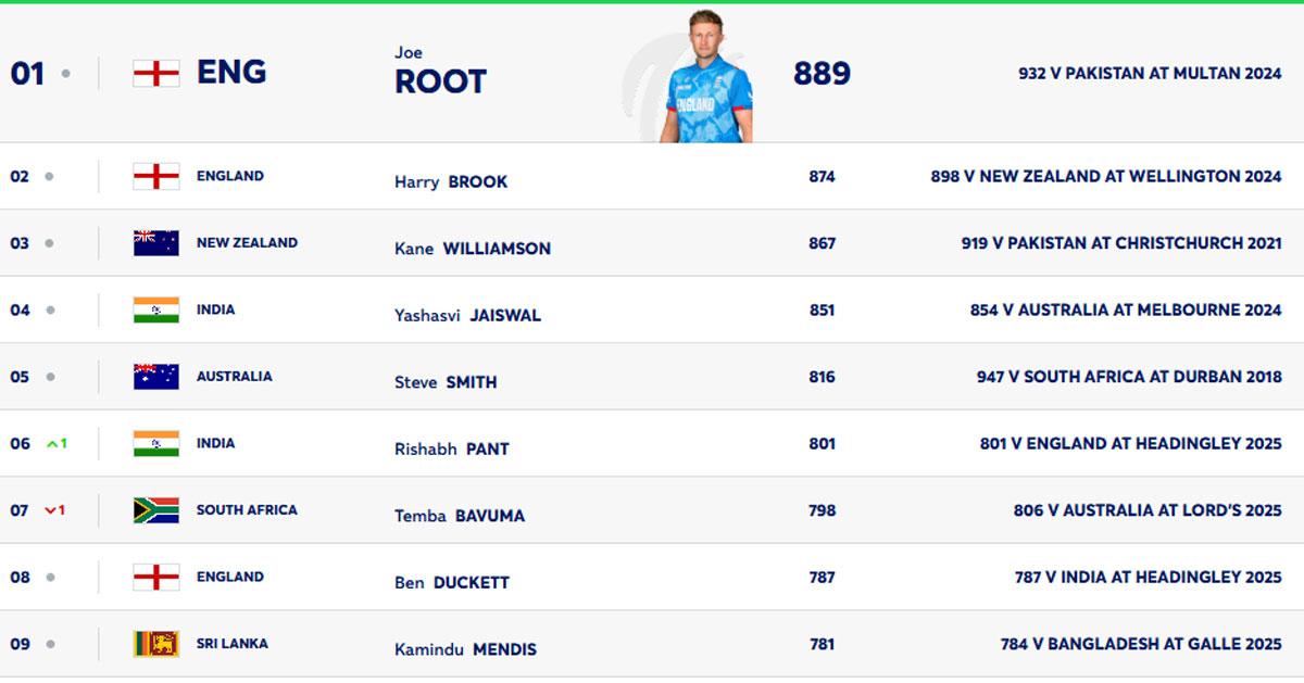 നിലവില്‍ ബാറ്റിങ് റാങ്കില്‍ ഒന്നാം സ്ഥാനത്തുള്ളത് ജോ റൂട്ടാണ്. 889 പോയിന്റാണ് താരം നേടിയത്. രണ്ടാം സ്ഥാനത്ത് 874 പോയിന്റുമായി ഹാരി ബ്രൂക്കും മൂന്നാം സ്ഥാനത്ത് കിവീസിന്റെ കെയ്ന്‍ വില്യംസന്‍ 867 പോയിന്റുമായി നിലയുറപ്പിച്ചിട്ടുണ്ട്. അതേസമയം റേറ്റിങ്ങില്‍ നാലാമനായിട്ടാണ് ഇന്ത്യയുടെ യശസ്വി ജെയ്സ്വാള്‍ ഇടം നേടിയത്. 851 പോയിന്റാണ് താരത്തിനുള്ളത്.