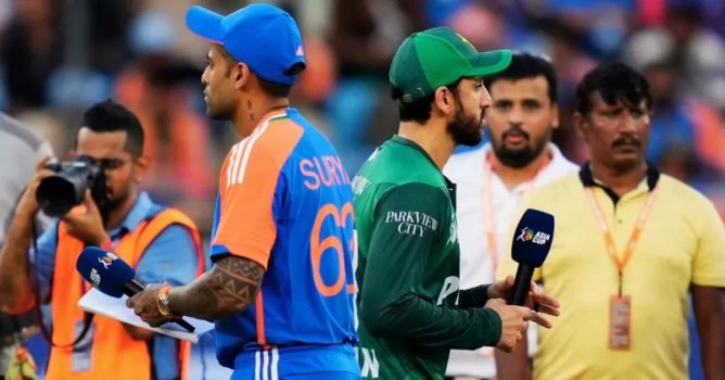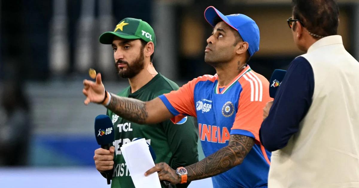 ഇന്ത്യന് ക്യാപ്റ്റന് സൂര്യകുമാര് യാദവും പാക് നായകന് സല്മാന് അലി ആഘയും. Photo: ICC