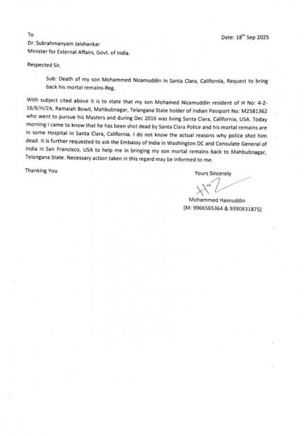 നിസാമുദ്ദീന്റെ മൃതദേഹം നാട്ടിലെത്തിക്കാനുള്ള നടപടികള് സ്വീകരിക്കണമെന്ന് ആവശ്യപ്പെട്ട് വിദേശകാര്യ മന്ത്രി എസ്. ജയ്ശങ്കറിന് ഹസ്നുദ്ദീന് കത്തയക്കുകയും ചെയ്തു. വാഷിങ്ടണിലെയും സാന് ഫ്രാന്സിസ്കോയിലെയും ഇന്ത്യന് ഉദ്യോഗസ്ഥരില് നിന്ന് യുവാവിന്റെ കുടുംബം അടിയന്തിര സഹായങ്ങള് തേടിയിട്ടുണ്ട്.