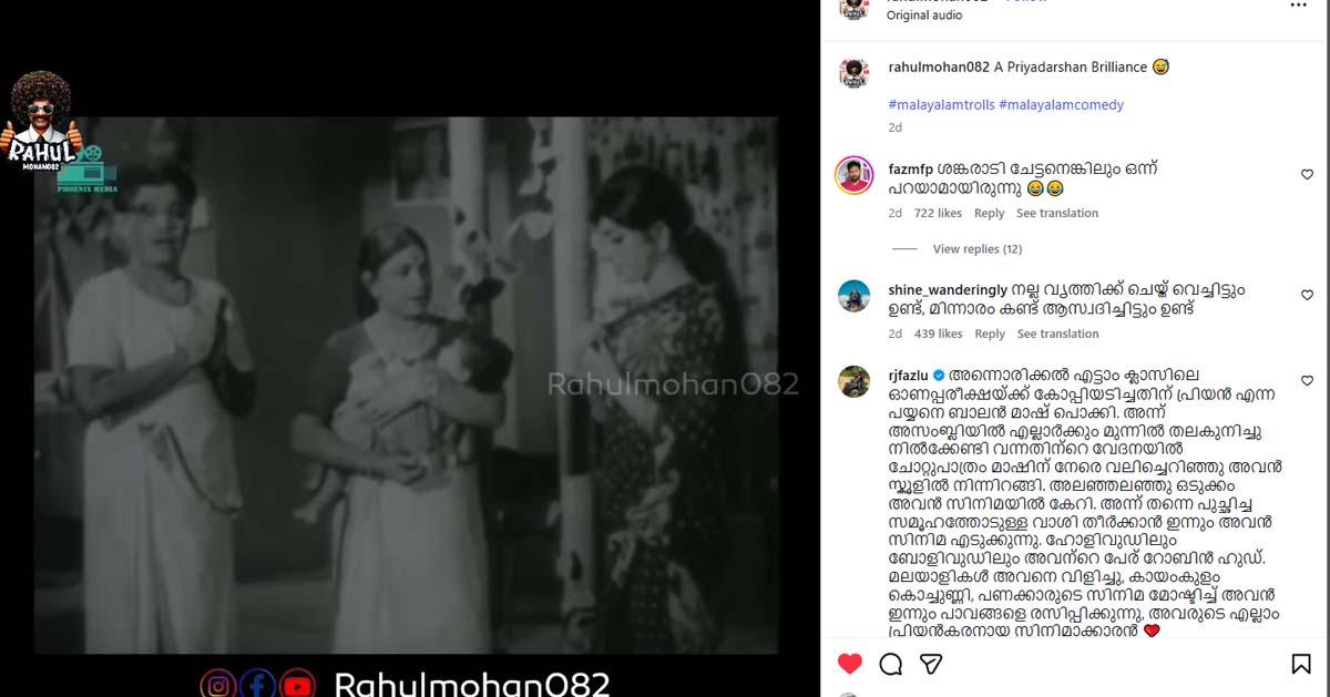 രാഹുല്മോഹന് എന്നയാളാണ് രണ്ട് സിനിമകളും തമ്മിലുള്ള സാമ്യത വീഡിയോരൂപത്തില് പങ്കുവെച്ചത്. ‘ചിങ്കാരക്കിന്നാരം’ എന്ന പാട്ട് ബ്രഹ്മചാരിയുടെ വീഡിയോക്ക് മിക്സ് ചെയ്തതാണ് റീലിന്റെ ഹൈലൈറ്റ്. ബ്രഹ്മചാരിയെക്കാള് എന്റര്ടൈന്മെന്റ് വാല്യു മിന്നാരത്തിനാണെന്ന് ഈ വീഡിയോയിലൂടെ വ്യക്തമാണ്. രസകരമായ പല കമന്റുകളും വീഡിയോയുടെ താഴെ പ്രത്യക്ഷപ്പെടുന്നുണ്ട്. എന്തൊക്കെ കോപ്പിയാണെന്ന് പറഞ്ഞാലും പ്രിയദര്ശന്റെ സിനിമകളെല്ലാം വേറെ ലെവലാണെന്നാണ് പ്രധാന കമന്റ്.