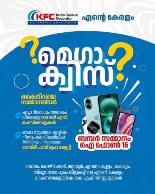 സംസ്ഥാനസർക്കാരിന്റെ നാലാം വാർഷികത്തോടനുബന്ധിച്ചുള്ള ‘എന്റെ കേരളം പ്രദർശനവിപണനമേള’യിലെ കേരള ഫിനാൻഷ്യൽ കോർപറേഷന്റെ സ്റ്റാളിൽ പൊതുജനങ്ങൾക്കായി ‘കെ.എഫ്.സി-എന്റെ കേരളം മെഗാ ക്വിസ്’ മത്സരം സംഘടിപ്പിക്കുമെന്ന് കോർപറേഷൻ. മത്സരത്തിലെ ബമ്പർ സമ്മാനമായി ആപ്പിൾ ഐഫോൺ 16 ആണ് നൽകുന്നത്.