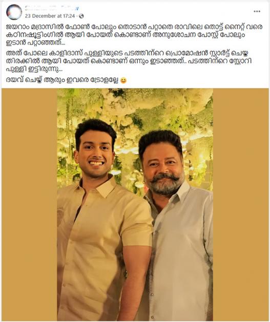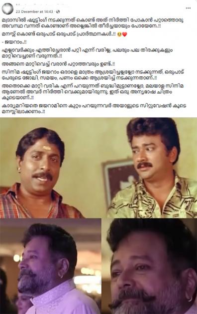 ജയറാമിനെ പിന്തുണച്ചും പോസ്റ്റുകളും ചര്ച്ചകളും ഉയരുന്നുണ്ട്. മദ്രാസില് ഷൂട്ടിങ് നിര്ത്തിപ്പോകാന് പറ്റാത്ത സാഹചര്യമായതുകൊണ്ടാണ് പോകാതിരുന്നതെന്നും കാര്യമറിയാതെ ജയറമിനെ കുറ്റപ്പെടുത്തരുതെന്നുമാണ് ഇവര് പറയുന്നത്. ജയറാമിന്റെ സാഹചര്യം കൂടി മനസിലാക്കിയ ശേഷം മാത്രം വിമര്ശിക്കണമെന്ന് പറയുന്നവരുമുണ്ട്.