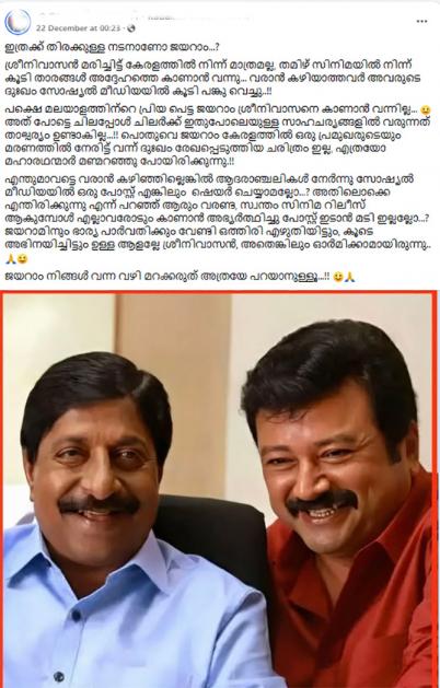 Content Highlight: Jayaram’s absence from Srinivasan’s death sparks criticism