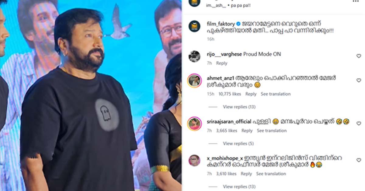 കരിയറില്‍ 150ലധികം സിനിമകള്‍ ചെയ്തിട്ടുണ്ടെങ്കിലും സോഷ്യല്‍ മീഡിയയില്‍ ജയറാമിന്റെ ‘ഐക്കോണിക് കഥാപാത്രം’ മേജര്‍ ശ്രീകുമാറാണ്. സോഷ്യല്‍ മീഡിയയുടെ കടന്നുവരവോടെ ട്രോളന്മാരുടെ സ്ഥിരം വേട്ടമൃഗമായി സലാം കാശ്മീര്‍ എന്ന ചിത്രം മാറി. റിലീസ് ചെയ്ത് 12 വര്‍ഷം കഴിഞ്ഞിട്ടും ശ്രീകുമാറിന്റെ ബാധ ജയറാമിനെ വിട്ടുപോയിട്ടില്ലെന്ന് പറഞ്ഞുകൊണ്ടുള്ള വീഡിയോയാണ് ഇപ്പോള്‍ വൈറല്‍.