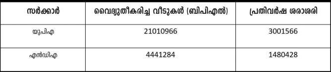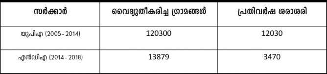 അതായത് യു.പി.എ സര്ക്കാര് പ്രതിവര്ഷം 12,030 ഗ്രാമങ്ങള് വൈദ്യുതവല്ക്കരിച്ചെങ്കില് എന്.ഡി.എ സര്ക്കാര് വെറും 3,470 ഗ്രാമങ്ങളാണ് പ്രതിവര്ഷം വൈദ്യുതവല്ക്കരിച്ചത്.