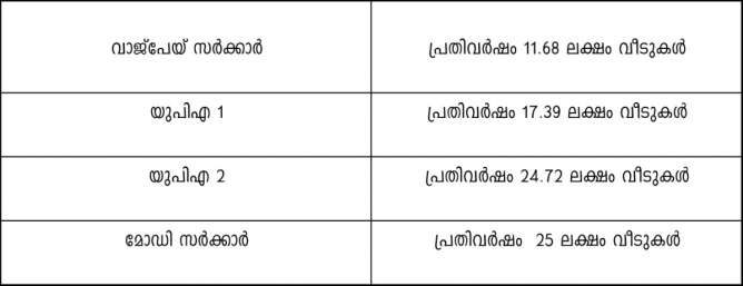 യു.പി.എ ഭരണകാലത്ത് 2009-2011 കാലയളവില് 123.6 ലക്ഷം വീടുകളാണ് നിര്മ്മിച്ചത്. ഈ കാര്യത്തില് മാറിവന്ന സര്ക്കാരുകളുടെ പ്രതിവര്ഷ ഗൃഹനിര്മ്മാണ കണക്കും പ്രസക്തമാണ്. മാറിവന്ന സര്ക്കാരുകള് ഈ വിഷയത്തില് പുലര്ത്തിയ വളര്ച്ചാ നിരക്ക് കുറയ്ക്കാന് മാത്രമേ മോഡി സര്ക്കാരിനായുള്ളു.