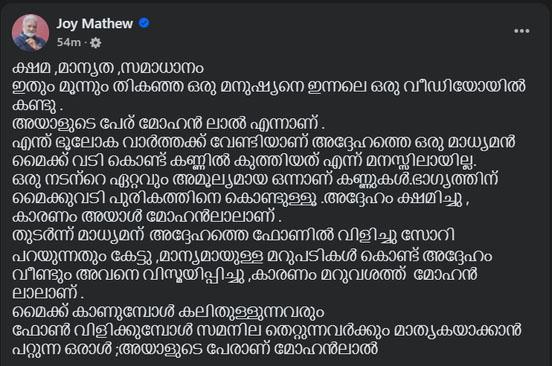 അയാളുടെ പേര് മോഹന്ലാല് എന്നാണെന്നും ജോയ് മാത്യു തന്റെ ഫേസ്ബുക്ക് പോസ്റ്റില് പറയുന്നു. മൈക്ക് കാണുമ്പോള് കലിതുള്ളുന്നവരും ഫോണ് വിളിക്കുമ്പോള് സമനില തെറ്റുന്നവര്ക്കും മാതൃകയാക്കാന് പറ്റുന്ന ഒരാളെന്നും നടന് പറഞ്ഞു.