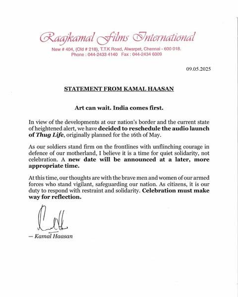 രാജ്യത്തിന്റെ അതിര്ത്തിയിലെ സംഭവവികാസങ്ങളും നിലവിലെ ജാഗ്രതാ നിര്ദ്ദേശവും കണക്കിലെടുത്താണ് തഗ് ലൈഫിന്റെ ഓഡിയോ ലോഞ്ച് പുനഃക്രമീകരിക്കാന് തീരുമാനിച്ചത്. ഓഡിയോ ലോഞ്ചിന്റെ പുതിയ തീയതി പിന്നീട് കൂടുതല് ഉചിതമായ സമയത്ത് പ്രഖ്യാപിക്കും.