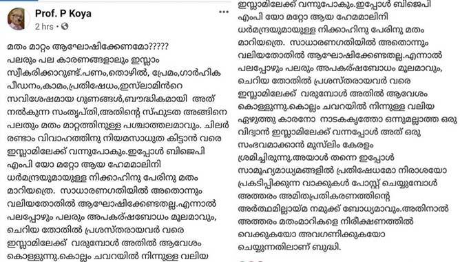 കമല് സി നജ്മലിനെ പരോക്ഷമായി പരാമര്ശിച്ചുകൊണ്ടായിരുന്നു പി കോയയുടെ ഫേസ്ബുക്ക് പോസ്റ്റ്. അത്തരം മതംമാറികളെ നിരീക്ഷണത്തില് വെക്കുകയോ അവഗണിക്കുകയോ ചെയ്യുന്നതിലാണ് ബുദ്ധിയെന്നും കോയ ഫേസ്ബുക്കില് പറഞ്ഞു.