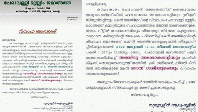 ‘2020 ജനവരി 19 -ാം തീയതി ഞായറാഴ്ച പകല് 11.30നും 12.30 നും മധ്യേ (കായംകുളം) ചേരാവള്ളി ജമാഅത്ത് പള്ളി അങ്കണത്തില് വച്ച് (ചേരാവള്ളി ക്ഷേത്രത്തിന് തെക്ക് വശം ‘അമൃതാജ്ഞലി’യില് പരേതനായ അശോകന്റെയും ശ്രീമതി ബിന്ദുവിന്റെയും മകള്) ബിന്ദു അശോകന്റെയും കാപ്പില് കിഴക്ക്, തൊട്ടേ തെക്കെടുത്ത് തറയില് ശ്രീ.ശശിധരന് ശ്രീമതി മിനി ശശി ദമ്പതികളുടെ മകന് ശരത് ശശിയുടേയും വിവാഹം നടത്തപ്പെടുകയാണ്.