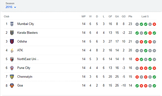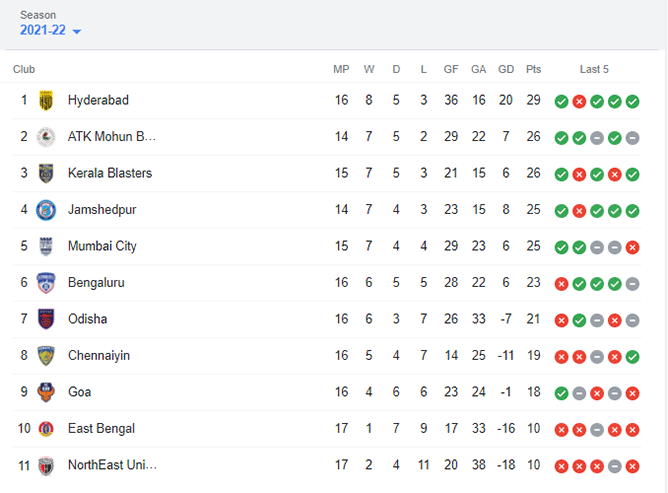 ഇപ്പോള് നടന്നുകൊണ്ടിരിക്കുന്ന സീസണില് 15 മത്സരത്തില് നിന്നും 7 ജയവും മൂന്ന് തോല്വിയും അഞ്ച് സമനിലയുമടക്കം 26 പോയിന്റുകളാണ് ബ്ലാസ്റ്റേഴ്സിനുള്ളത്. നിലവില് പോയിന്റ് പട്ടികയില് മൂന്നാം സ്ഥാനക്കാരാണ് കൊമ്പന്മാര്.