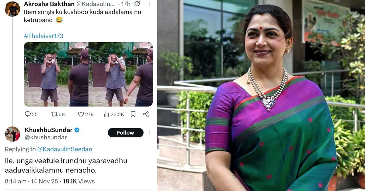 ‘ഇല്ല, നിന്റെ വീട്ടില് നിന്ന് ആരെയെങ്കിലും ഡാന്സ് ചെയ്യിക്കാമെന്ന് വിചാരിച്ചു’ എന്നാണ് ഖുശ്ബു നല്കിയ മറുപടി. ഈ പോസ്റ്റിന്റെയും മറുപടിയുടെയും സ്ക്രീന്ഷോട്ട് സമൂഹമാധ്യമങ്ങളില് വൈറലായിക്കഴിഞ്ഞു. ഇത്രയും നല്ല മറുപടി അയാള് ഒരിക്കലും വിചാരിച്ചില്ലെന്നാണ് ഖുശ്ബുവിന്റെ കമന്റിന് താഴെ പലരും കുറിച്ചത്.
