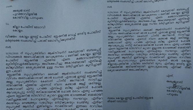 ” എന്റെ സുഹൃത്ത് ശ്രീഹരി ഈസ്റ്റ് പൊലീസ് സ്റ്റേഷനിലേക്ക് വരണമെന്ന് പറഞ്ഞു. സ്റ്റേഷനില് ചെന്ന് ഞാന് കാര്യം തിരക്കി. പക്ഷെ കിളികൊല്ലൂര് സ്റ്റേഷനിലായിരുന്നു സുഹൃത്ത് വരാന് ആവശ്യപ്പെട്ടത്. എന്നാല് സ്റ്റേഷനില് എത്തിയപ്പോള് തന്നെ നിന്റെ മുടിയൊന്നും കണ്ടിട്ട് ആളു ശരിയല്ലല്ലോ, ഫോണ് തരണം എന്ന് പൊലീസ് ആവശ്യപ്പെട്ടു. ഫോണ് തരാം രസീത് തരണമെന്നാണ് ഞാന് പറഞ്ഞത്. അപ്പോള് പെട്ടന്ന് ദേഷ്യം വന്ന എസ്.ഐ കുത്തിന് പിടിച്ച് അകത്തേക്ക് വലിച്ച് കൊണ്ടു പോയി. എസ്.ഐയുടെയും എ.എസ്.ഐയുടെയും റൂമിന്റെ ഇടയില് കയറ്റി നിര്ത്തി എസ്.ഐയും കുറേ പൊലീസുകാരും ഇടിക്കുകയും മര്ദ്ദിക്കുകയും ചെയ്തു.