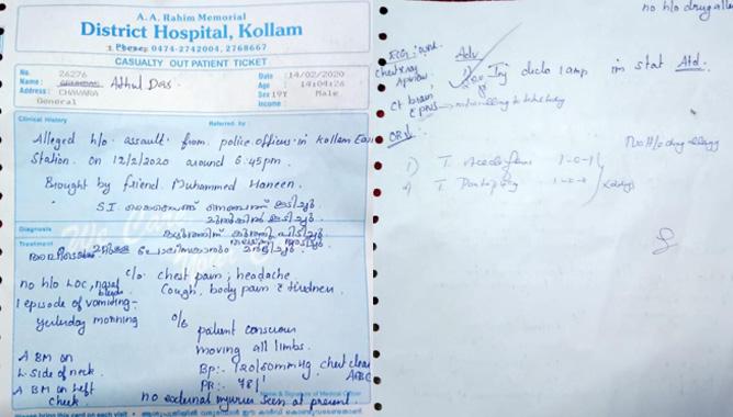 ഫെബ്രുവരി 12 നാണ് അതുല് ദാസ് കൊല്ലം ഈസ്റ്റ് പൊലീസ് സ്റ്റേഷനില് എത്തുന്നത്. സ്റ്റേഷനില് എത്തിയ അതുല് ദാസിനോട് എസ്.ഐ ഫോണ് ആവശ്യപ്പെട്ടപ്പോള് ഫോണ് കൈപ്പറ്റി എന്ന രസീറ്റ് തരികയാണെങ്കില് ഫോണ് തരാം എന്ന് അതുല് ദാസ് മറുപടി കൊടുത്തു. ഇതില് രോഷാകുലനായ എസ്.ഐയും സംഘവും സി.സി.ടി.വി ഇല്ലാത്ത ഭാഗത്തേക്ക് ബലമായി വലിച്ചുകൊണ്ടു പോയി മര്ദ്ദിക്കുകയായിരുന്നു എന്നാണ് അതുല് ആരോപിക്കുന്നത്. ഇതു സംബന്ധിച്ച് അതുല് ദാസ് ഡി.ജി.പിക്ക് പരാതി നല്കിയിരിക്കുകയാണ്. സ്റ്റേഷനില് ഒപ്പം എത്തിയ സുഹൃത്ത് ആസിഫിന്റെ മുന്നിലിട്ടാണ് പൊലീസ് മര്ദ്ദിച്ചതെന്ന് അതുല് പറയുന്നു. കൊല്ലം ജില്ലാ ആശുപത്രിയില് ചികിത്സയിലായിരുന്ന അമ്മയാണ് അതുല് ദാസിനെ ജാമ്യത്തിലിറക്കുന്നത്.