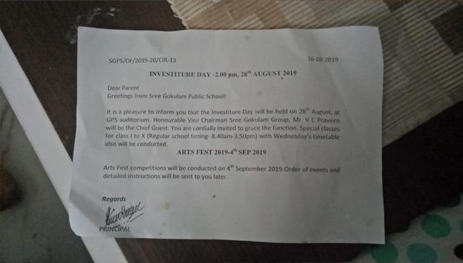 അയ്യന്കാളി ദിനമായ ബുധനാഴ്ച കെ.ജി സെക്ഷന് ഒഴിച്ചുള്ള ക്ലാസുകള്ക്ക് സാധാരണ ടൈംടേബിള് പ്രകാരം രാവിലെ 8.40 മുതല് 3.50 വരെ ക്ലാസ് നടക്കുമെന്നും രണ്ട് മണിക്ക് ഇന്വെസ്റ്റിച്ചര് ഡേ നടക്കുമെന്നും കാണിച്ച് സ്കൂള് അധികൃതര് രക്ഷിതാക്കള്ക്ക് നേരത്തെ തന്നെ നോട്ടീസ് നല്കിയിരുന്നു.