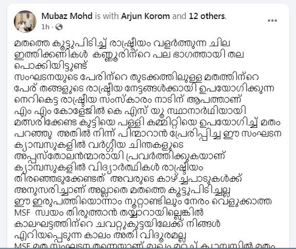 എം.എം. കോളേജില് കെ.എസ്.യു സ്ഥാനാര്ത്ഥിയായി മത്സരിക്കേണ്ട വിദ്യാര്ത്ഥിയെ പള്ളി കമ്മിറ്റിയെ ഉപയോഗിച്ച് മതം പറഞ്ഞ് എം.എസ്.എഫ് പിന്മാറാന് പ്രേരിപ്പിച്ചുവെന്നും മുബാസ് ആരോപിച്ചു. ക്യാമ്പസുകളില് എം.എസ്.എഫ് വര്ഗീയ ചിന്തകളുടെ അപ്പസ്തോലന്ന്മാരായി പ്രവര്ത്തിക്കുകയാണെന്നും കെ.എസ്.യു നേതാവ് പറയുന്നു.