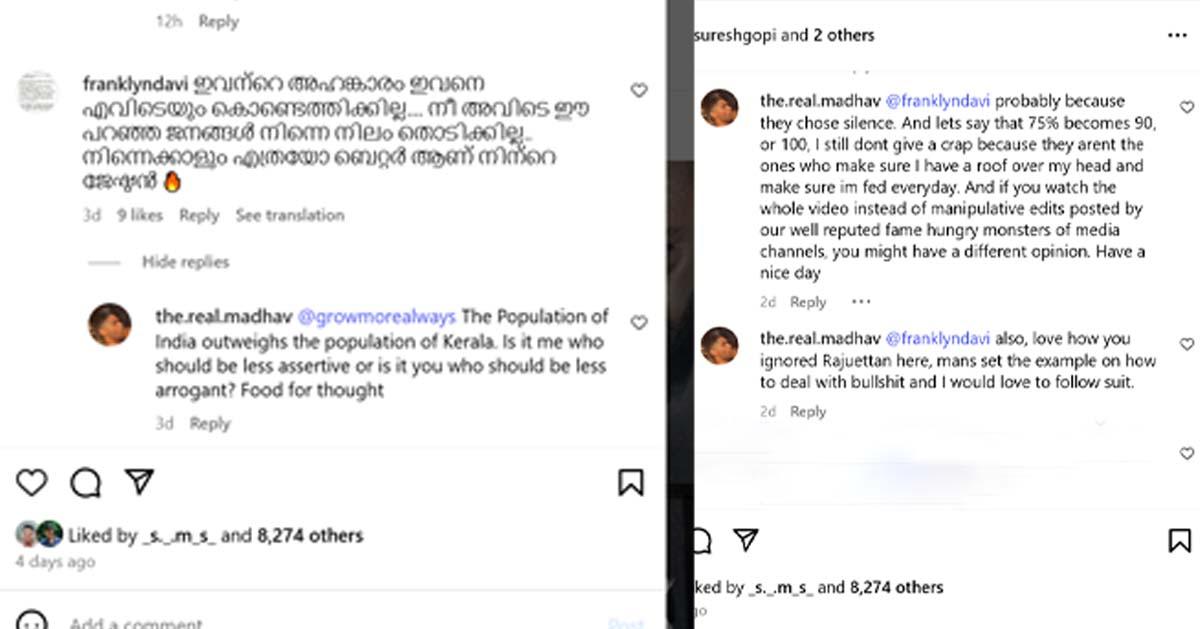 ‘സോഷ്യല് മീഡിയയില് എന്നെ വ്യക്തിഹത്യ ചെയ്യുന്ന തരത്തില് എഡിറ്റഡ് വീഡിയോ ചെയ്യുന്ന കുറച്ചാളുകളല്ല എനിക്ക് ഭക്ഷണം തരുന്നത്. അവരെയെല്ലാം ഞാന് മൈന്ഡ് ചെയ്യുന്നില്ല. പണ്ട് രാജുവേട്ടനെയും നിങ്ങള് അവഗണിച്ചിരുന്നു. ഇന്ന് അദ്ദേഹം എവിടെയെത്തിയെന്ന് നോക്കൂ. ഇത്തരം കാര്യങ്ങളോട് അദ്ദേഹം എടുത്ത നിലപാടാണ് ഞാനും ഫോളോ ചെയ്യുന്നത്’ എന്നും മാധവ് മറുപടി നല്കി.