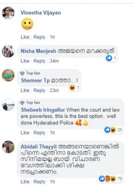 നീതി നടപ്പാക്കപ്പെട്ടുവെന്നാണ് ടൊവിനോ തോമസിന്റെ പ്രതികരണം. ഫേസ്ബുക്കിലാണ് പൊലീസിന്റെ പ്രവൃത്തിയെ പ്രകീര്ത്തിച്ച് ടൊവിനോയുടെ പ്രതികരണം. അതേ സമയം തന്നെ ടൊവിനോയുടെ നിലപാടിനെ വിമര്ശിച്ച് നിരവധി പേര് രംഗത്തെത്തി. ടൊവിനോ അഭിനയിച്ച മായാനദി എന്ന ചിത്രത്തിലെ മാത്തന്, കുപ്രസിദ്ധ പയ്യനിലെ അജയന് എന്നീ കഥാപാത്രങ്ങളെ ചൂണ്ടിക്കാട്ടിയാണ് വിമര്ശനം.