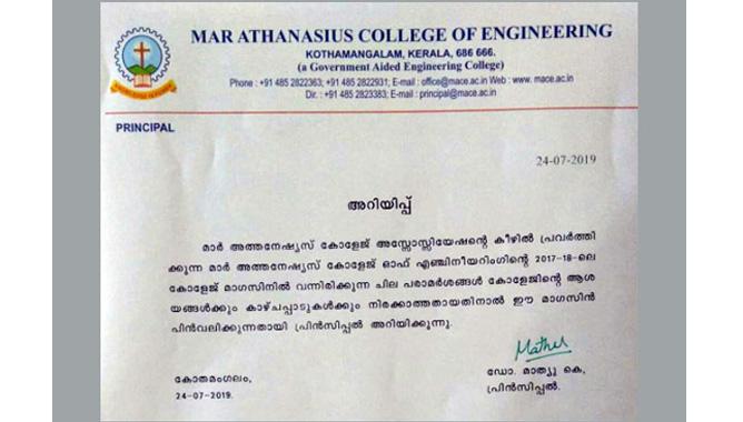 കോതമംഗലം: കോതമംഗലം മാര് അത്തനേഷ്യസ് കോളേജ് ഓഫ് എഞ്ചിനീയറിംഗിലെ കോളേജ് മാഗസിനെതിരെ സംഘപരിവാര് സംഘടനകള് രംഗത്തെത്തിയതിന് പിന്നാലെ മാഗസിന് പിന്വലിച്ച് കോളേജ് മാനേജ്മെന്റ്.