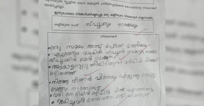 ഇഷ്ടപ്പെട്ട കളിക്ക് നിയമാവലി എഴുതുക എന്ന ചോദ്യത്തിനാണ് അഹാന്‍ വ്യത്യസ്തമായ ഉത്തരം നല്‍കിയത്. ഇഷ്ടപ്പെട്ട കളിയായി സ്പൂണും നാരങ്ങയും തെരഞ്ഞെടുത്ത അഹാന്‍, ഒരേ സമയം അഞ്ച് പേര്‍ക്ക് മത്സരിക്കാമെന്നും കളിക്കുമ്പോള്‍ നാരങ്ങ നിലത്തുവീണാല്‍ വീണ്ടും സ്പൂണില്‍ വെച്ച് നടക്കണമെന്നും, അടയാളപ്പെടുത്തിയ വരി തെറ്റിക്കരുതെന്നും നിലത്തുവീണ നാരങ്ങ വീണ്ടുമെടുത്ത് കളി തുടരാമെന്നും വരിതെറ്റിയാല്‍ പുറത്താക്കുമെന്നും തുടങ്ങിയ കളി നിയമങ്ങള്‍ ഉത്തരക്കടലാസില്‍ കുറിച്ചിരുന്നു.