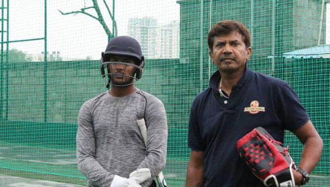 മായങ്ക് അഗര്വാള് പരിശീലകന് ആര്.എക്സ് മുരളിയോടൊപ്പം