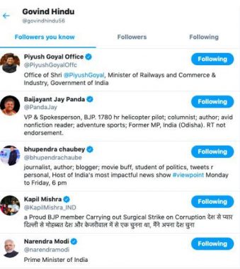 ആ അക്കൗണ്ട് ഫോളോ ചെയ്യുന്നവരില് പ്രധാനമന്ത്രി നരേന്ദ്രമോദി, റെയില്വേമന്ത്രി പീയുഷ് ഗോയല്, ബി.ജെ.പി വക്താവ് ബൈജയന്ത് ജയ് പാണ്ട, ബി.ജെ.പി നേതാവ് കപില് മിശ്ര തുടങ്ങിയ പ്രമുഖര് ഉള്പ്പെടും.
