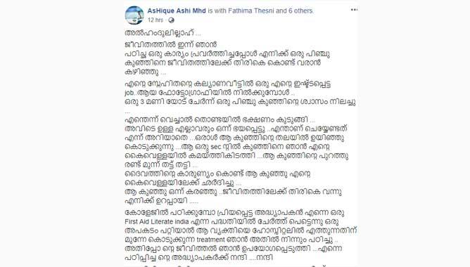 അവിടെ ഉള്ള എല്ലാവരും ഒന്ന് ഭയപ്പെട്ടു ..എന്താണ് ചെയ്യേണ്ടത് എന്ന് അറിയാതെ …ഒരാള് ആ കുഞ്ഞിന്റെ തലയില് ഉഴിഞ്ഞു കൊടുക്കുന്നു …ആ ഒരു സെക്കന്റില് കുഞ്ഞിനെ ഞാന് എന്റെ കൈവെള്ളയില് കമഴ്ത്തി കിടത്തി … കുഞ്ഞിന്റെ പുറത്തു രണ്ട് മുന്ന് തട്ട് തട്ടി …ആ കുഞ്ഞു എന്റെ കൈവെള്ളയിലേക്ക് ഛര്ദിച്ചു…ആ കുഞ്ഞു ഒന്ന് കരഞ്ഞു ..ജീവിതത്തിലേക്ക് തിരികെ വന്നുവെന്ന് എനിക്ക് ഉറപ്പായി …..
