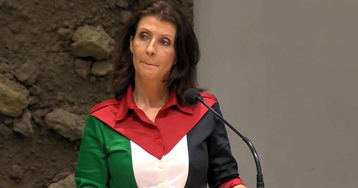 Content Highlight: MP Esther Ouwehand arrives at Dutch parliament wearing a dress resembling the Palestinian flag