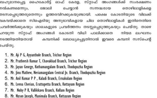 മുത്തൂറ്റിന്റെ ഹെഡ് ഓഫീസടക്കം 10 ഓഫീസുകള്ക്ക് സംരക്ഷണമേര്പ്പെടുത്തണമെന്ന് ഹൈക്കോടതി നേരത്തെ ഉത്തരവിട്ടിരുന്നു. ജീവനക്കാരെ സുഗമമായി പ്രവര്ത്തിക്കാന് അനുവദിക്കണമെന്നും ജോലിക്കെത്തുന്നവരെ തടയാന് സമരക്കാര്ക്ക് അവകാശമില്ലെന്നും കോടതി സര്ക്കാരിനും പൊലീസിനും നിര്ദ്ദേശം നല്കിയിരുന്നു. ഈ ഉത്തരവനുസരിച്ചാണ് സസ്പെന്ഷനെന്ന് മുത്തൂറ്റ് മാനേജ്മെന്റ് പുറത്തിറക്കിയ വാര്ത്താ കുറിപ്പില് പറയുന്നു.