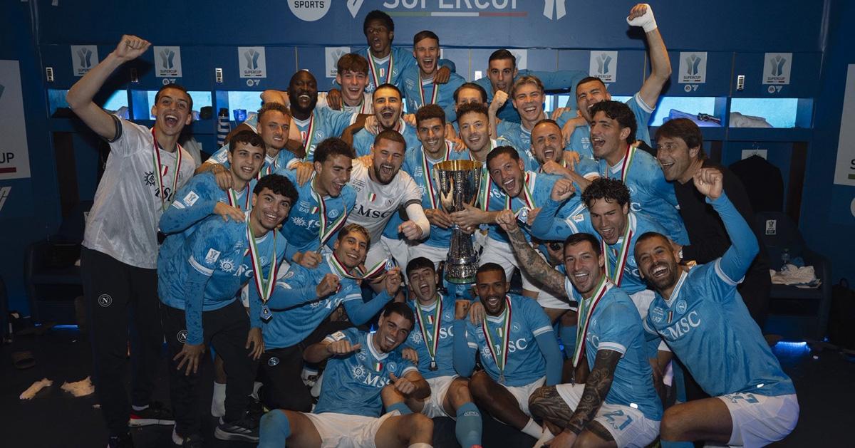 ഇറ്റാലിയൻ സൂപ്പർ കപ്പുമായി നാപോളി താരങ്ങൾ. Photo: Oficial SSC Napoli/ x.com