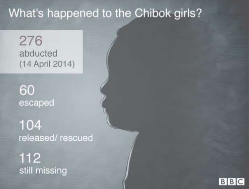 2014 ഏപ്രില് 14 ഞായറാഴ്ചയാണ് നൈജീരിയയിലെ ബോണോ സംസ്ഥാനത്തെ ചിബോക്കിലെ ഒരു സെക്കന്ററി സ്കൂളില് നിന്നും പെണ്കുട്ടികളെ ബോക്കോ ഹറാം തീവ്രവാദികള് തട്ടിക്കൊണ്ട് പോകുന്നത്. പെണ്കുട്ടികളില് ഭൂരിപക്ഷവും ക്രിസ്തുമത വിശ്വാസികളായിരുന്നു. തട്ടിക്കൊണ്ടു പോകലിനിടെ 60 പെണ്കുട്ടികള് രക്ഷപ്പെടുകയും 219 പേരെ തീവ്രവാദികള് തടവിലാക്കുകയും ചെയ്തു.