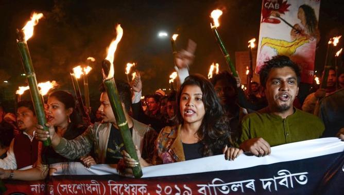 Gauhati University students take part in a torchlight rally during a protest against the Citizenship Amendment Bill.