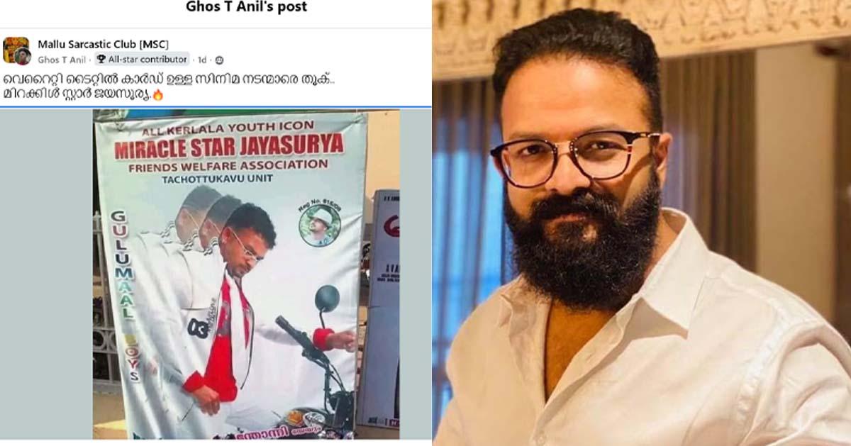 മലയാളത്തിലെ മികച്ച നടന്മാരില് ചിലരായ ജയസൂര്യ, ഇന്ദ്രജിത്, ആസിഫ് അലി എന്നിവരുടെ പഴയകാല ഫ്ളെക്സിന്റെ ഫോട്ടോ വൈറലായിരിക്കുകയാണ്. ഫേസ്ബുക്കിലെ മല്ലു സര്ക്കാസ്റ്റിക് ക്ലബ്ബെന്ന പ്രൈവറ്റ് ഗ്രൂപ്പിലാണ് പോസ്റ്റ് പങ്കുവെച്ചത്. ജയസൂര്യയുടെ പഴയകാല ഫ്ളെക്സിന്റെ ഫോട്ടോയാണ് പോസ്റ്റിലുള്ളത്. മിറാക്കിള് സ്റ്റാര് ജയസൂര്യ എന്നാണ് ഫ്ളെക്സില് നല്കിയിരിക്കുന്ന ടൈറ്റില്.