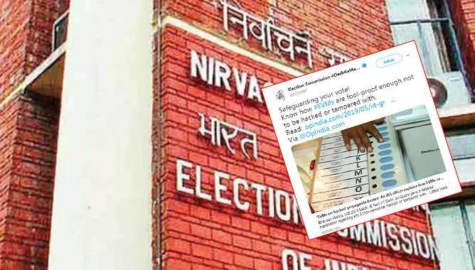 തെരഞ്ഞെടുപ്പ് ഫലത്തിന് മണിക്കൂറുകള് മാത്രം ശേഷിക്കെയാണ് സംഘപരിവാര് അനുകൂല ഓണ്ലൈന് പോര്ട്ടലിലെ വാര്ത്ത തെരഞ്ഞെടുപ്പ് കമ്മീഷന്റെ ട്വിറ്റര് അക്കൗണ്ടില് പങ്കുവെച്ചത്. ഓപ്ഇന്ത്യ ഡോട്ട് കോം പോര്ട്ടലിലെ ഇ.വി.എം ഹാക്ക് ചെയ്യാനാകില്ലെന്ന ലേഖനമാണ് ട്വിറ്റര് പേജില് തെരഞ്ഞെടുപ്പ് കമ്മീഷന് പങ്കുവെച്ചിരുന്നത്.