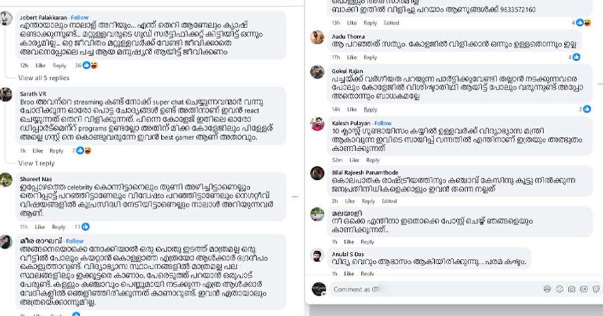 പോസ്റ്റിന് താഴെ എതിര്ത്തും അനുകൂലിച്ചും നിരവധി കമന്റുകള് പങ്കുവെക്കപ്പെടുന്നുണ്ട്. ഇന്ത്യയിലെ ഏറ്റവും മികച്ച ഗെയിമര്മാരില് ഒരാളാണ് സായിപ്പെന്നും കോളേജിലെ പരിപാടിയില് പങ്കെടുത്തതില് തെറ്റില്ലെന്നുമാണ് പ്രധാന കമന്റ്. ‘തെറി വിളിച്ചിട്ടാണെങ്കിലും ഗെയിമിലൂടെ നല്ല രീതിയില് കാശുണ്ടാക്കുന്നുണ്ട്. ആരുടെയും ഗുഡ് സര്ട്ടിഫിക്കറ്റിന് വേണ്ടി ജീവിക്കുന്നില്ല’ എന്നും ഒരാള് കമന്റ് പങ്കുവെച്ചു.